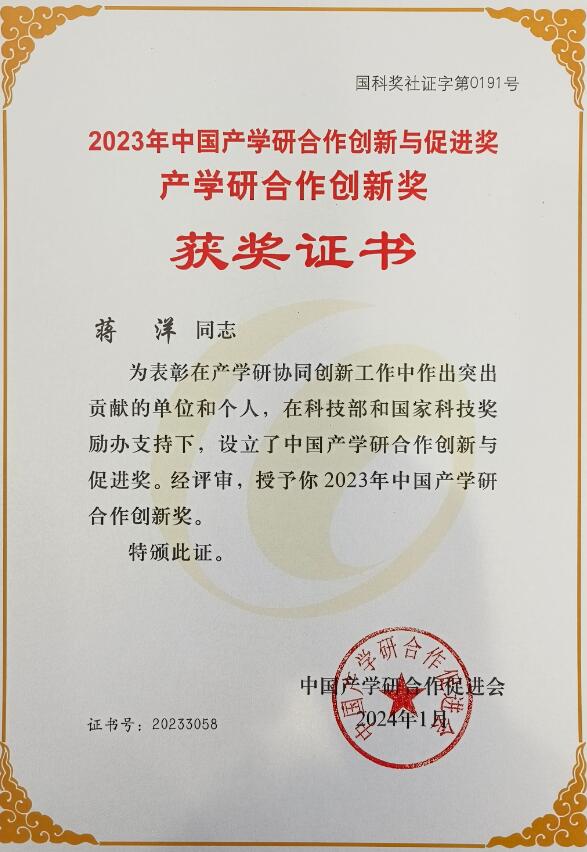 中國產(chǎn)學(xué)研合作創(chuàng)新與促進(jìn)獎經(jīng)科技部和國家科技獎勵辦批準(zhǔn),由中國產(chǎn)學(xué)研合作促進(jìn)會設(shè)立,每年評選一次,旨在表彰產(chǎn)學(xué)研創(chuàng)新合作工作中做出突出貢獻(xiàn)的先進(jìn)單位和個人,是我國產(chǎn)學(xué)研界協(xié)同創(chuàng)新的最高榮譽(yù)獎。2023年,蔣洋大力踐行中國能建《若干意見》及“1466”戰(zhàn)略,引領(lǐng)綠色建材公司開辟了能源新材料和基建新材料兩個全新的業(yè)務(wù)板塊。與北京錦石光宇新能源有限公司聯(lián)合研發(fā)的新一代BIPV組件,一經(jīng)推出就收獲了國內(nèi)外大批合作意向,獲得中國BIPV十大品牌獎,與日本東京大學(xué)、土與蔬菜株式會社聯(lián)合研發(fā)的“基于工農(nóng)業(yè)固廢再生土壤的創(chuàng)新技術(shù)”,獲2023(第四屆)國際碳中和與綠色投資大會“零碳中國”十大創(chuàng)新技術(shù)。