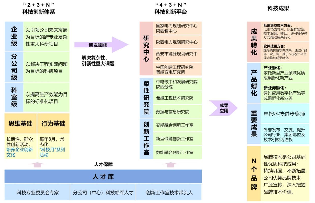 統(tǒng)籌搭建科技創(chuàng)新平臺(tái)。以“助推市場(chǎng)開發(fā)、加速業(yè)務(wù)轉(zhuǎn)型、孵化新型業(yè)務(wù)”為導(dǎo)向,聚焦關(guān)鍵核心技術(shù)攻關(guān),整合匯聚內(nèi)外部資源,搭建了“4+3+N”科技創(chuàng)新平臺(tái),即“國(guó)家電力規(guī)劃研究中心陜西省中心”“陜西省電力規(guī)劃研究中心”“西安市能源規(guī)劃研究中心”“中國(guó)能建智能變電技術(shù)研究所”4個(gè)外部科技創(chuàng)新平臺(tái);“中電碳中和發(fā)展研究院陜西分院”“儲(chǔ)能工程技術(shù)研究院”“數(shù)據(jù)與信息研究院”3個(gè)柔性組織研究院;“交能融合創(chuàng)新工作室”“新型儲(chǔ)能創(chuàng)新工作室”“數(shù)能融合創(chuàng)新工作室”等N個(gè)創(chuàng)新工作室。“4+3+N”科技創(chuàng)新平臺(tái)建設(shè)優(yōu)化了科技創(chuàng)新資源配置,提升了關(guān)鍵核心技術(shù)攻關(guān)能力,推動(dòng)了科技成果轉(zhuǎn)化孵化,促進(jìn)了陜西院科技創(chuàng)新能力快速提升。