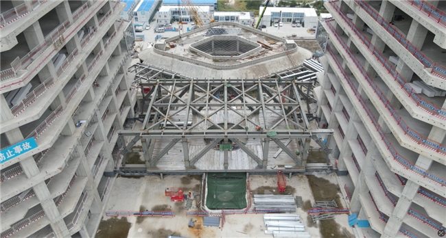 突破常規(guī),技術(shù)創(chuàng)新引領(lǐng)千噸連廊平地起。為降低施工風(fēng)險(xiǎn)、提高施工效率,項(xiàng)目根據(jù)國(guó)內(nèi)外類(lèi)似工程建造經(jīng)驗(yàn),查閱大量國(guó)內(nèi)外相關(guān)專(zhuān)業(yè)資料,逐一攻克了鋼結(jié)構(gòu)轉(zhuǎn)換胎架拼裝平臺(tái)免回頂技術(shù)、鋼結(jié)構(gòu)桁架預(yù)起拱技術(shù)、鋼連廊結(jié)構(gòu)自提升技術(shù)、鋼連廊液壓整體提升技術(shù),為鋼結(jié)構(gòu)連廊施工全過(guò)程提供技術(shù)保障。