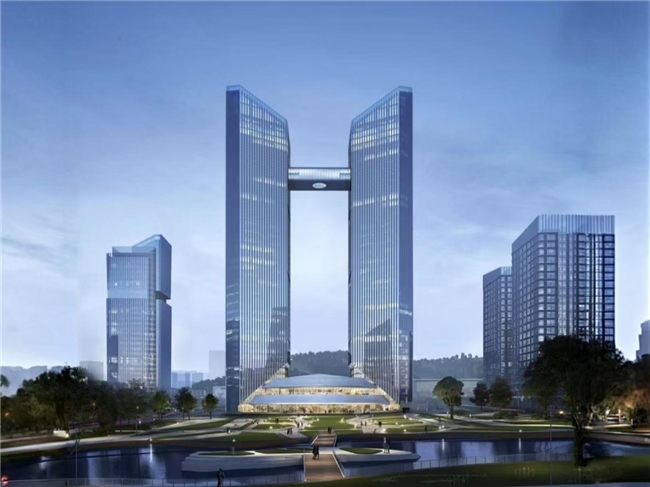 國(guó)惠科創(chuàng)中心項(xiàng)目位于濟(jì)南市高新區(qū)漢峪金谷片區(qū),總建筑面積33.51萬(wàn)平方米,其中一標(biāo)段建筑面積16.7萬(wàn)平方米。包含兩棟45層商務(wù)辦公樓,建筑高度220米。底部為3層商業(yè)裙房,地下室共5層,包含1層設(shè)備夾層。主要功能為商務(wù)辦公、商業(yè)等。雙子塔樓38至40層設(shè)計(jì)有一個(gè)鋼結(jié)構(gòu)連廊將兩棟塔樓連通,采用鋼桁架結(jié)構(gòu)體系,總重約960噸,鋼連廊距地高度172.5米,跨度45.5米,寬度20.8米,高度9.15米,跨越兩層結(jié)構(gòu)。