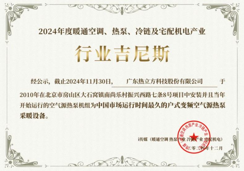 熱泵行業(yè)媒體i傳媒近日向熱立方地暖機(jī)頒發(fā)了一項(xiàng)榮譽(yù)——中國市場運(yùn)行時(shí)間最久的戶式變頻空氣源熱泵采暖設(shè)備。據(jù)了解,該設(shè)備于2010年在北京市房山區(qū)大石窩鎮(zhèn)南尚樂村振興西路七條8號項(xiàng)目中安裝,并且當(dāng)年開始運(yùn)行,歷經(jīng)15個(gè)供暖季后,依然穩(wěn)定運(yùn)行無故障,創(chuàng)造了中國市場運(yùn)行時(shí)長的行業(yè)紀(jì)錄。該項(xiàng)檢測由“建筑環(huán)能科技有限公司建筑環(huán)境與能源檢測院”完成檢測認(rèn)證。