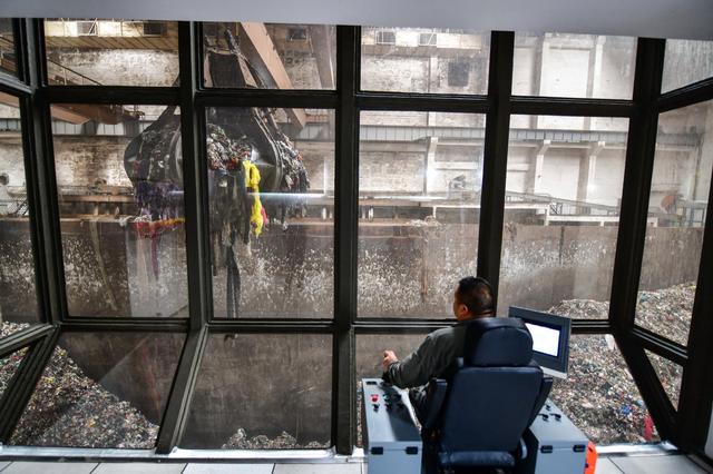9月19日,在山東啟迪濟(jì)能環(huán)??萍加邢薰?,工作人員在控制室內(nèi)操作設(shè)備吊運(yùn)垃圾。