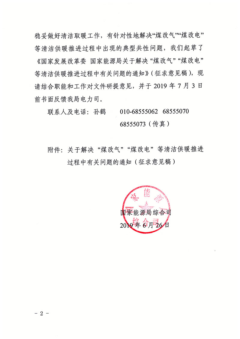 國家能源局綜合司征求《關于解決“煤改氣”“煤改電”等清潔供暖推進過程中有關問題的通知》意見的函