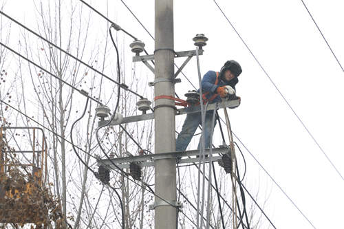 圖為搶修人員冒雪安裝新的導(dǎo)線,盡全力在最短時(shí)間內(nèi)恢復(fù)線路正常運(yùn)行。(徐浩然)