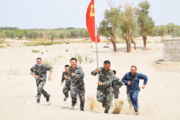 接著,大家從十六團交叉路口出發(fā),高聲歌唱著“沒有共產(chǎn)黨就沒有新中國”“團結(jié)就是力量”等紅色革命歌曲,沿河床徒步前行5公里,并穿插開展“沙漠沖拼”“坐地起身”“人椅”等豐富多彩的素質(zhì)拓展比拼項目。一路上,大家熱情高漲、團結(jié)協(xié)作、奮勇爭先,團隊合作精神體現(xiàn)得淋漓盡致。雖然天氣炎熱,道路崎嶇,但沒有一個人退縮、沒有一個人掉隊,圓滿完成拓展訓練任務。“這次黨的生日活動別樣有趣,讓我們在繁忙的工作之余感受到素質(zhì)拓展的趣味和意義,考驗和鍛煉了大家的意志,促進了黨員之間的交流、信任與默契,有助于提升黨員隊伍的凝聚力和戰(zhàn)斗力。” 黨員崔陽陽興致勃勃地說。