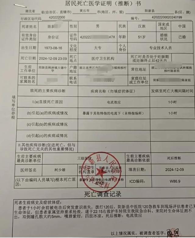 陳勇的中學(xué)同事們把他背到救護(hù)車能到達(dá)的地方,醫(yī)生說(shuō)已經(jīng)沒(méi)有搶救的必要了。在家屬堅(jiān)持下,他被送到醫(yī)院,經(jīng)過(guò)搶救后還是被宣布身亡。死亡推斷書顯示,直接死亡原因?yàn)?ldquo;電流效應(yīng)”。