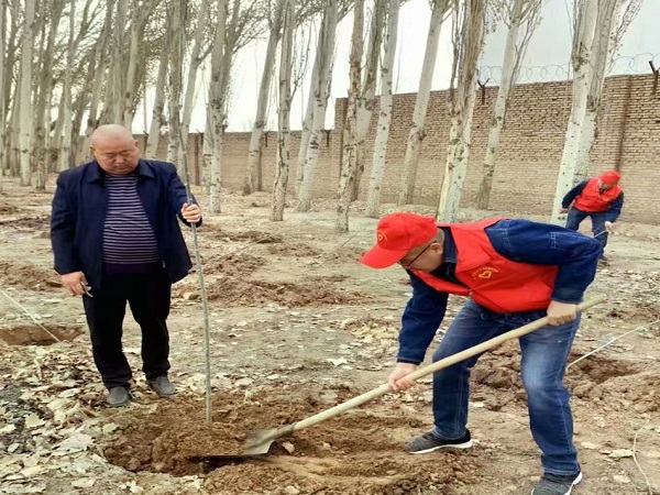 上午十點,春風(fēng)送爽,天氣宜人。20余名員工按照分工要求,同志們迫不及待地拿起鐵鍬開始鏟土,認(rèn)真細(xì)致地挖著樹苗和土坑,一陣緊張的忙碌過后,大家將樹苗立在土坑上面,扶好樹苗,精心的完成著從挖坑、放樹、填土、踩實到最后澆水的每一個步驟,有條不紊,很快一棵樹苗站立起來。