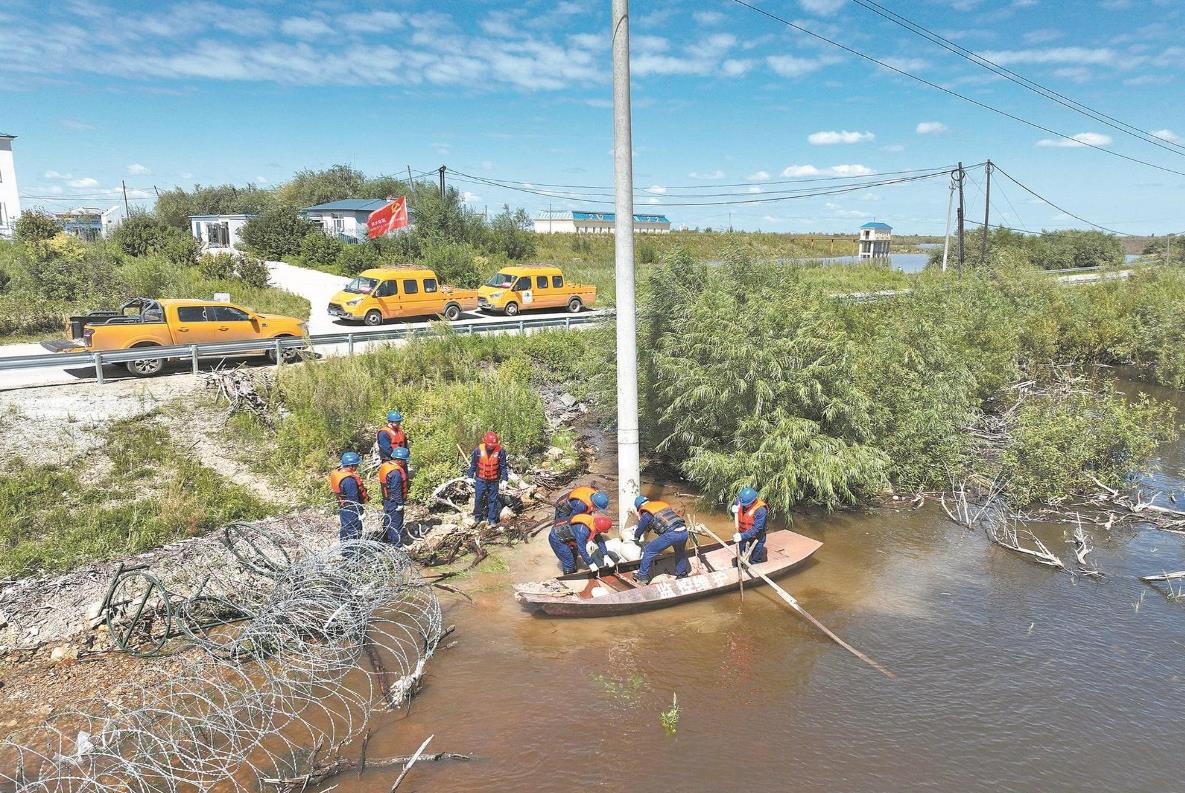 8月14日,黑龍江佳木斯供電公司員工在烏蘇鎮(zhèn)加固10千伏廣場線131號電桿基礎(chǔ),保障線路安全運行。吳迪 攝