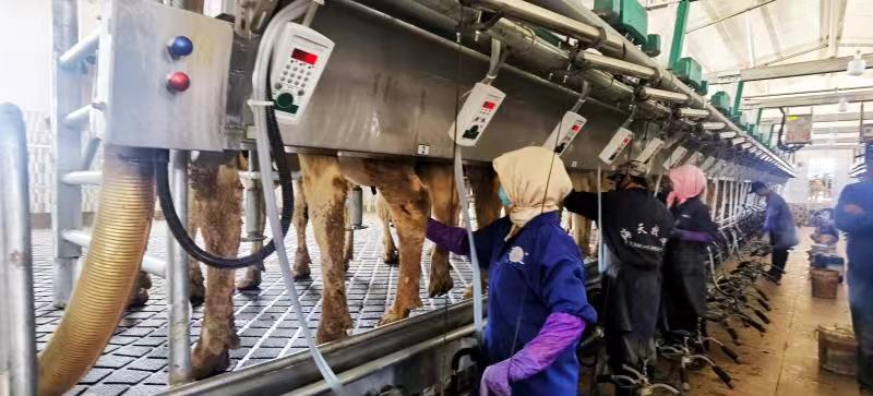 擠奶車間里,黑白相間的奶牛列隊走上緩緩轉(zhuǎn)動的擠奶轉(zhuǎn)臺,工人們依次對它們進行采奶前的乳頭清洗消毒工作,隨后,德國原裝進口轉(zhuǎn)盤擠奶機對奶牛進行自動擠奶??粗还晒蓾嵃椎娜橹鬟M容器,場長郭宏勝露出喜悅的笑容。