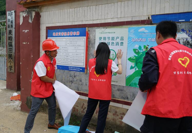 南方電網(wǎng)廣西富川縣公司青年志愿者在村完小張貼宣傳畫