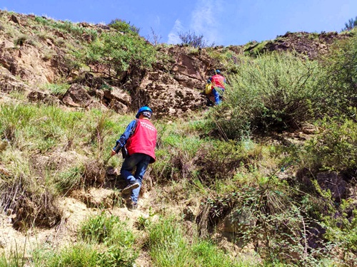 張富進(jìn)和師傅正在“翻山越嶺”去巡線