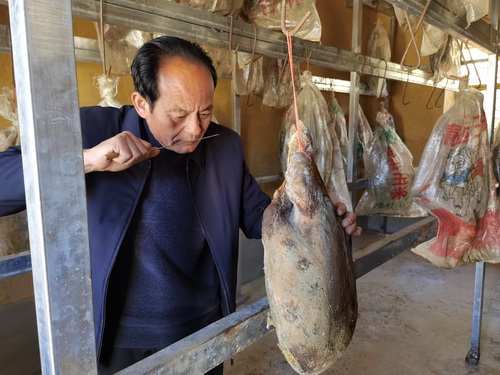 腌制火腿是黎馬村村民傳承已久的儲(chǔ)肉技藝,加上當(dāng)?shù)鬲?dú)特的氣候環(huán)境,黎馬火腿形美色艷香糯的獨(dú)特品質(zhì)一直在當(dāng)?shù)匦∮忻麣?。但單家單戶腌制火腿不光?guī)模小,質(zhì)量也參差不齊。黎馬火腿雖然作為當(dāng)?shù)氐奶厣r(nóng)產(chǎn)品,但一直未能創(chuàng)造出良好的經(jīng)濟(jì)價(jià)值。如何挖掘黎馬村火腿特色,將鄉(xiāng)村特色轉(zhuǎn)化為鄉(xiāng)村經(jīng)濟(jì)是李華所在的工作隊(duì)長(zhǎng)期思考的問題。
