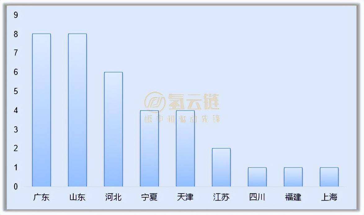 廣東、山東各有8個(gè)氫能項(xiàng)目。各地區(qū)項(xiàng)目分布情況如圖表2所示,其中廣東和山東各以8個(gè)項(xiàng)目并列第一、河北以6項(xiàng)位列第2、寧夏和天津則以4項(xiàng)并列第3三。其中廣東的投資額達(dá)245億元。