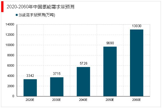 2020年,我國(guó)氫氣需求量約3342萬(wàn)噸,在2030年碳達(dá)峰情景下,我國(guó)氫氣的年需求量將提高到3715萬(wàn)噸,在終端能源消費(fèi)中占比約5%;到2060年我國(guó)氫氣的年需求量將增至約13030萬(wàn)噸,在終端能源消費(fèi)中占比約20%。