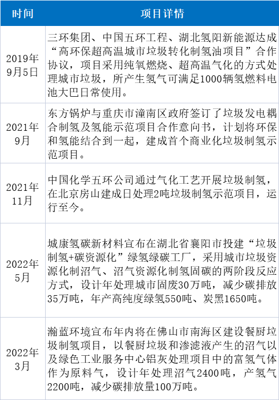 國內(nèi)而言,主要以環(huán)保企業(yè)、頗具實(shí)力的上市公司開拓業(yè)務(wù)為主。三環(huán)集團(tuán)、瀚藍(lán)環(huán)境、中國化學(xué)、東方鍋爐等陸續(xù)從2019年開始布局垃圾制氫項(xiàng)目。詳情如下: