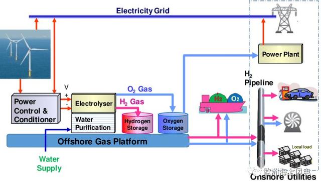Dolphyn則是由ERM公司開(kāi)發(fā)的、基于浮式風(fēng)電的電解制氫技術(shù),即在浮式風(fēng)機(jī)平臺(tái)上配置制氫設(shè)備,風(fēng)機(jī)發(fā)電就地制氫,然后通過(guò)管道將氫氣輸送到岸上。