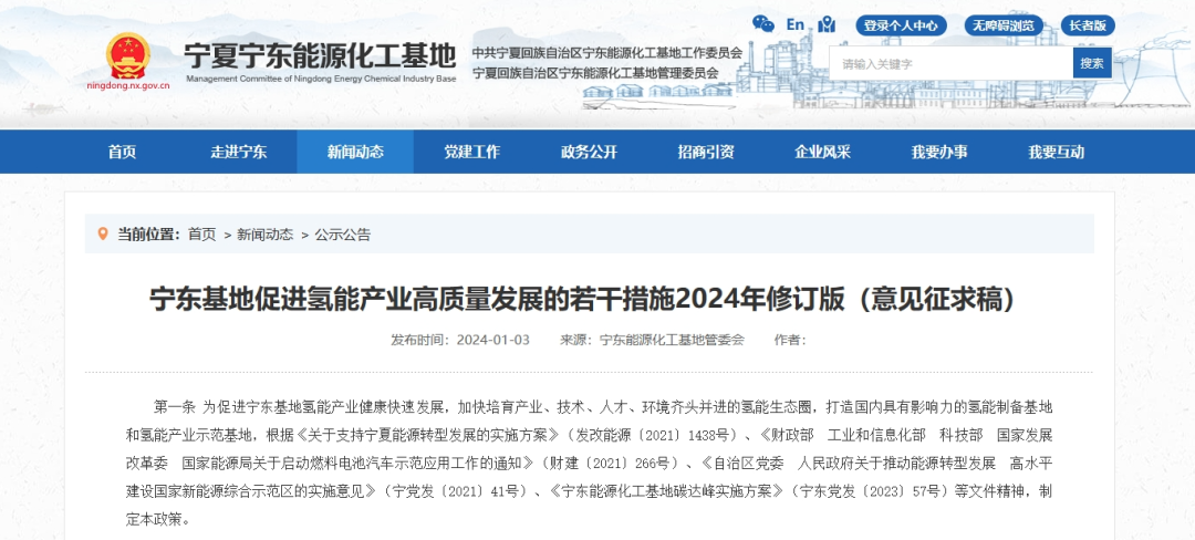 1月3日,寧東能源化工基地管委會發(fā)布寧東基地促進(jìn)氫能產(chǎn)業(yè)高質(zhì)量發(fā)展的若干措施2024年修訂版(送審稿),其中指出,鼓勵、支持企業(yè)向綠氫生產(chǎn)和應(yīng)用方向轉(zhuǎn)型升級,在建設(shè)時序上,應(yīng)確保制氫和應(yīng)用端先開工,新能源部分不得早于制氫負(fù)荷及應(yīng)用設(shè)施投產(chǎn);制氫及應(yīng)用分期投產(chǎn)的,配套新能源應(yīng)按對應(yīng)規(guī)模分期建設(shè)。