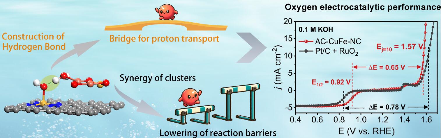 基于此,研究工作2報道了一種原子全暴露的Fe摻雜的CuO團簇與單原子位點協(xié)同的新型催化劑。實驗和DFT計算表明:一方面,協(xié)同的Cu-O-Fe 團簇能有效誘導(dǎo)鐵單原子位點的電子結(jié)構(gòu)重新分布、調(diào)節(jié)氧吸附能并降低 ORR 勢壘;另一方面,譜學(xué)表征和理論計算表明Cu-O-Fe團簇協(xié)同構(gòu)建了含氧反應(yīng)中間體與電解質(zhì)分子之間的氫鍵,所構(gòu)建的氫鍵不僅可以穩(wěn)定含氧反應(yīng)中間體,同時拉伸了ORR最后一步的Fe-O鍵長,有助于OH*的脫附;更為質(zhì)子傳輸提供了通道,提高了反應(yīng)動力學(xué)。這項研究中展示的新穎的催化劑結(jié)構(gòu)和協(xié)同機制,為開發(fā)綠色能源轉(zhuǎn)換裝置中的高性能催化劑提供了新的視角和參考。