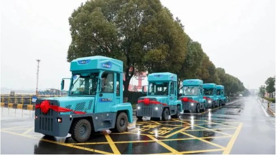 在張家港港務(wù)集團(tuán)港埠分公司倉庫內(nèi),5臺氫燃料港口專用牽引車一字排開,整齊壯觀。這些牽引車長3.8米、寬2米、高3米,屬于非道路移動機(jī)械,主要用于港區(qū)內(nèi)件雜貨水平運(yùn)輸作業(yè)。它們的最大牽引載重量可達(dá)60噸,在氫瓶充滿的情況下可至少連續(xù)運(yùn)行8小時,還擁有噪音低、操作舒適等特點(diǎn),其排放物為純凈水并采用一鍵自動排水設(shè)計。