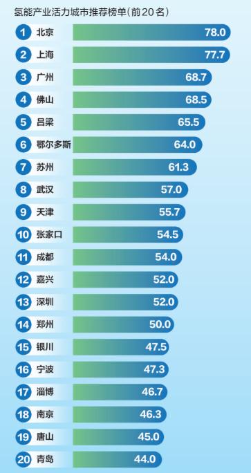 基于全國氫能產業(yè)發(fā)展的地區(qū)分布特點 ,新京報零碳研究院對主要城市的氫能資源稟賦 、政策環(huán)境 、產業(yè)規(guī)模 、項目投資 、基礎設施和企業(yè)數量等維度數據進行了量化和綜合評價 ,篩選出了全國20個氫能產業(yè)發(fā)展活力城市 。具體城市名單如下: