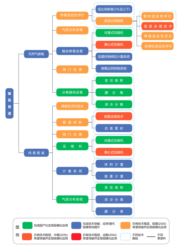 預(yù)計2025年前后,我國將形成完善的天然氣管道摻氫輸送適用性評價技術(shù),實現(xiàn)2~3個氫氣管道示范項目平穩(wěn)運行,部分天然氣管道摻氫量達到5%。預(yù)計到2030年,我國各類輸氫管道建成總里程將突破5000公里;預(yù)計到2035年,天然氣管道摻氫輸送技術(shù)基本具備廣泛推廣條件,實現(xiàn)“西氫東送”且成本可控,氫氣管道(含摻氫天然氣管道)總里程達到萬公里級別。2050年,高壓力大口徑長輸管道輸氫技術(shù)成熟且經(jīng)濟可行,完成覆蓋全國范圍的純氫管道及摻氫天然氣管道系統(tǒng)建設(shè)。
