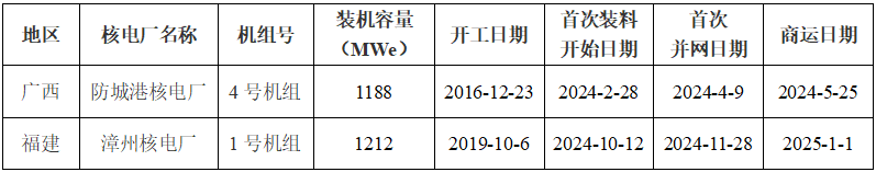 1)漳州核電廠1號機組2024年10月12日裝料,本表格中發(fā)電量及上網(wǎng)電量數(shù)據(jù)為調試期間電量,能力因子暫無數(shù)據(jù)。