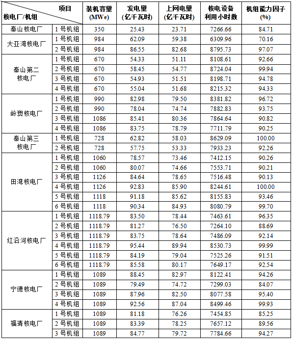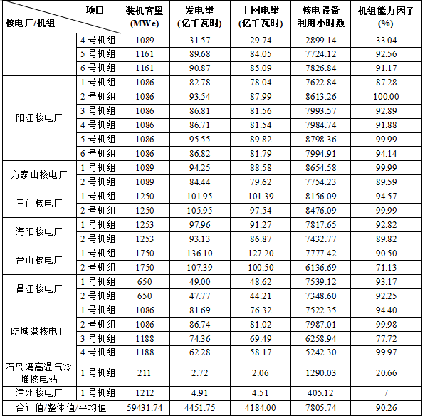 3)本表“合計值/整體值/平均值”中,裝機容量、發(fā)電量、上網(wǎng)電量為各機組合計值,核電設備利用小時數(shù)為全部機組整體值,機組能力因子為全部參與統(tǒng)計機組的算數(shù)平均值。