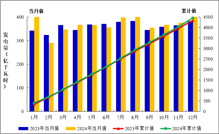 圖2:2023年1月至2024年12月全國運行核電機組發(fā)電量趨勢