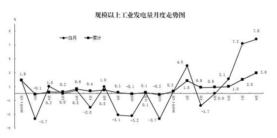 8月份,規(guī)模以上工業(yè)發(fā)電量同比增長7.8%,增速比7月份加快0.6個百分點;1-8月份,規(guī)模以上工業(yè)發(fā)電量同比增長3.0%,增速比1-7月份加快1.0個百分點。