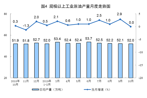 10月份,原油生產(chǎn)1611萬(wàn)噸,產(chǎn)量與去年同期基本持平;日均產(chǎn)量52.0萬(wàn)噸,環(huán)比減少0.1萬(wàn)噸。1—10月份,原油生產(chǎn)15925萬(wàn)噸,同比增長(zhǎng)1.1%。