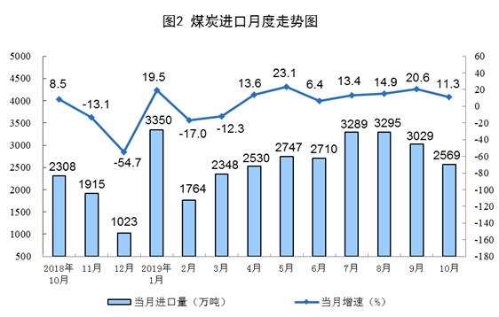 10月份,煤炭進(jìn)口2568.5萬(wàn)噸,同比增長(zhǎng)11.3%,增速比上月回落9.3個(gè)百分點(diǎn);1—10月份,煤炭進(jìn)口2.8億噸,同比增長(zhǎng)9.6%。