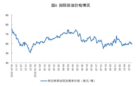 10月份,國(guó)際原油價(jià)格震蕩下跌,10月31日布倫特原油現(xiàn)貨離岸價(jià)格為59.3美元/桶,比9月30日下降1.69美元。