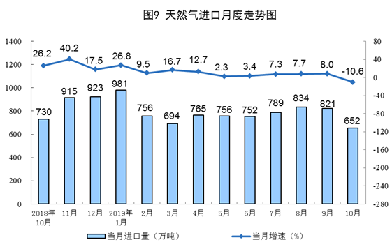 10月份,天然氣進(jìn)口652萬(wàn)噸,同比下降10.6%,增速由正轉(zhuǎn)負(fù),上月為增長(zhǎng)8.0%。1—10月份,天然氣進(jìn)口7771萬(wàn)噸,同比增長(zhǎng)7.9%。