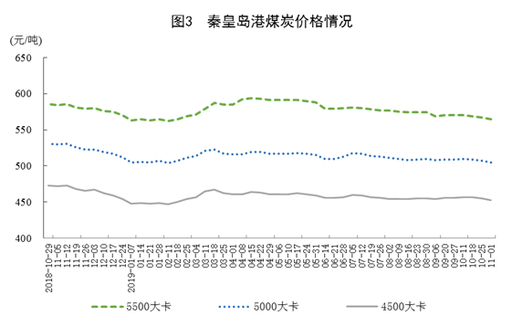 煤炭?jī)r(jià)格小幅下跌。11月1日,秦皇島港5500大卡、5000大卡和4500大卡煤炭綜合交易價(jià)格分別為每噸565元、505元和453元,比9月底分別回落5元、4元和3元。