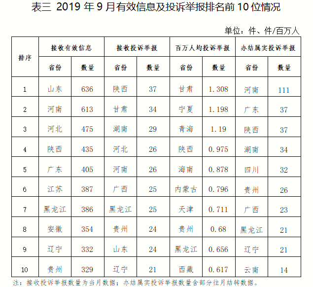 各省(自治區(qū)、直轄市)按照收到的有效信息數(shù)量排序,山東、河南、河北、陜西、廣東等排在全國前10位;按照投訴舉報(bào)數(shù)量排序,陜西、甘肅、湖南、河北、河南等排在全國前10位。按照百萬人均投訴舉報(bào)數(shù)量排序,甘肅,寧夏,青海,陜西,海南等排在全國前10位。按照辦結(jié)屬實(shí)投訴舉報(bào)數(shù)量排序,河南、廣東、陜西、湖南、四川等排在全國前10位。(2019年9月有效信息及投訴舉報(bào)排名前10位情況見表三)