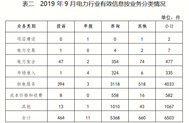 電力行業(yè)排在首位,有效信息數(shù)量為6503件,占全部有效信息的77.62%;其中受理的投訴舉報(bào)數(shù)量為475件,占全部投訴舉報(bào)數(shù)量的94.81%。群眾反映的問題主要集中在供電服務(wù)、電力安全、成本價格和收費(fèi)等方面。(2019年9月電力行業(yè)有效信息按業(yè)務(wù)分類情況見表二)
