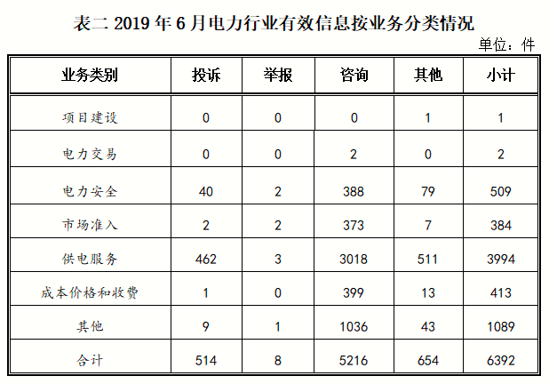 電力行業(yè)排在首位,有效信息數(shù)量為6392件,占全部有效信息的80.33%;其中受理的投訴舉報數(shù)量為522件,占全部投訴舉報數(shù)量的93.38%。群眾反映的問題主要集中在供電服務、電力安全、成本價格和收費等方面。(2019年6月電力行業(yè)有效信息按業(yè)務分類情況見表二)