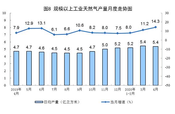 天然氣生產(chǎn)加快。4月份,生產(chǎn)天然氣161億立方米,同比增長14.3%,增速比上月加快3.1個百分點(diǎn),日均產(chǎn)量5.4億立方米。1—4月份,生產(chǎn)天然氣644億立方米,同比增長10.3%。