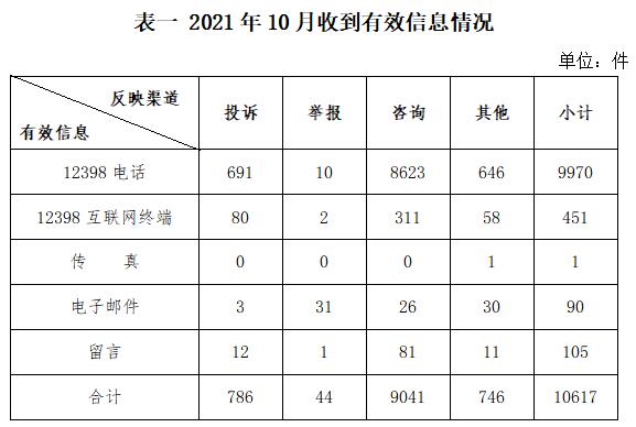按反映渠道分類,12398電話9970件,12398互聯網終端451件,傳真1件,電子郵件90件,留言105件。