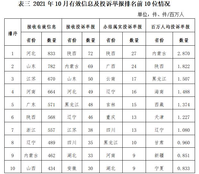 各省(自治區(qū)、直轄市)按照接收的有效信息數量排序,河北、山東、江蘇、河南、廣東、陜西、浙江、遼寧、內蒙古、山西列全國前10位;按照接收的投訴舉報數量排序,陜西、內蒙古、山東、河北、黑龍江、遼寧、江蘇、四川、湖北、安徽排在全國前10位;按照辦結屬實的投訴舉報數量排序,陜西、廣西、云南、遼寧、吉林、重慶、四川、黑龍江、河南、湖北排在全國前10位;按照百萬人均投訴舉報數量排序,內蒙古、陜西、黑龍江、海南、西藏、天津、遼寧、甘肅、新疆、寧夏排在全國前10位。(2021年10月有效信息及投訴舉報排名前10位情況見表三)