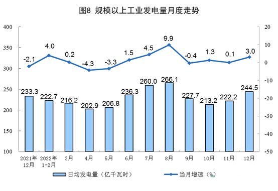 電力生產(chǎn)增速加快。12月份,發(fā)電7579億千瓦時,同比增長3.0%,增速比上月加快2.9個百分點,日均發(fā)電244.5億千瓦時。2022年,發(fā)電8.4萬億千瓦時,同比增長2.2%。