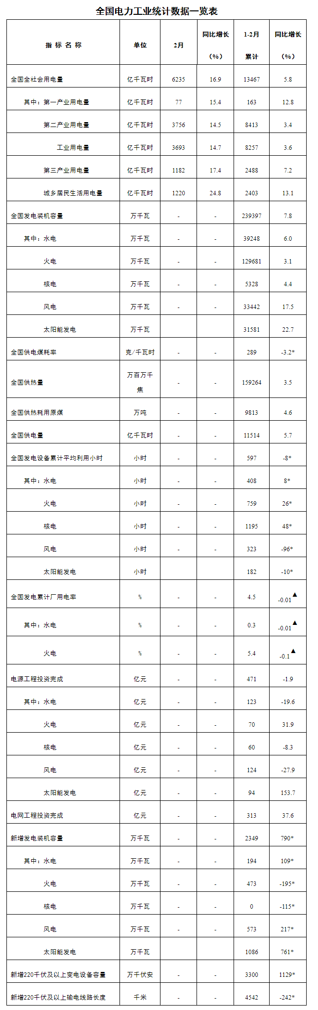 注:1.全社會(huì)用電量為全口徑數(shù)據(jù),全國供電量為調(diào)度口徑數(shù)據(jù)。2.“同比增長”列中,標(biāo)*的指標(biāo)為絕對量;標(biāo)▲的指標(biāo)為百分點(diǎn)。
