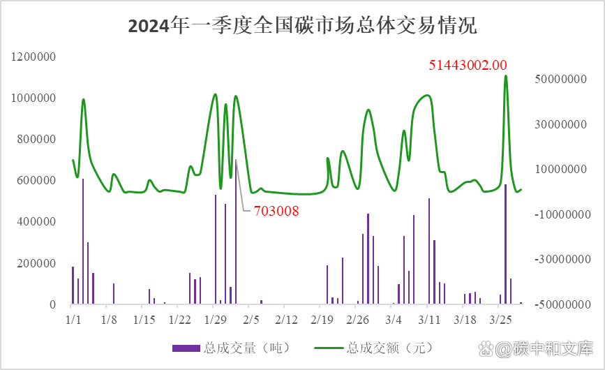 具體交易情況如下圖所示:2024年一季度碳市場掛牌協(xié)議交易碳配額總計3067072噸,交易金額達(dá)到了252341511.54元,交易均價為82.27元/噸。其中2024年2月29日交易量和交易金額最多,分別為331398噸和28482226元。大宗協(xié)議交易碳配額總計5548187噸,交易金額達(dá)到了420928187.9元,交易均價為75.87元/噸。其中2024年2月2日交易量最多達(dá)到了630000噸,2024年3月8日交易金額最大為46949458元。