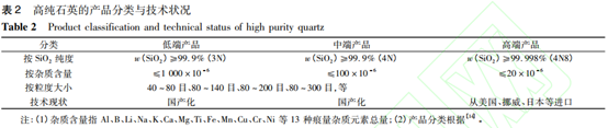 高純石英(high-purityquartz)是SiO2純度大于99.9%的石英系列產(chǎn)品的總稱。如表2所示,其產(chǎn)品等級(jí)可按SiO2純度或Al、B、Li、K、Na、Ca、Mg、Ti、Fe、Mn、Cu、Cr、Ni等雜質(zhì)元素總量進(jìn)行劃分,每個(gè)等級(jí)的高純石英可按粒度分為不同粒度大小的品種。