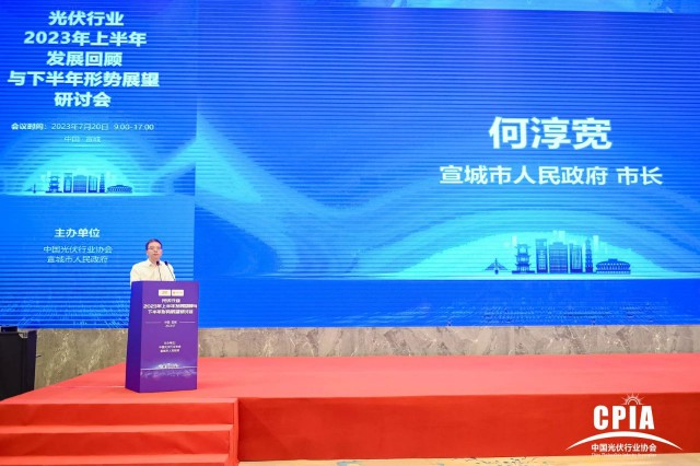 2023年7月20日,由中國光伏行業(yè)協(xié)會、宣城市人民政府主辦的“光伏行業(yè)2023年上半年發(fā)展回顧與下半年形勢展望研討會”在安徽省宣城市成功舉辦。宣城市人民政府何淳寬市長出席會議并致辭。