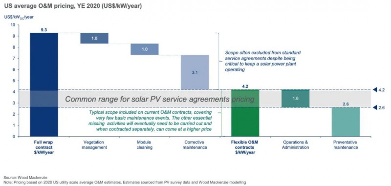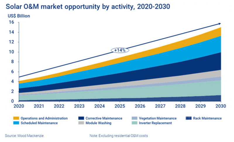 伍德麥肯茲發(fā)布最新研究報告Global solar PV operations and maintenance (O&M) economics market report 2021(《2021年全球光伏運維市場經(jīng)濟性研究》,預(yù)計至2030年,全球非住宅光伏電站的運營和維護(O&M)支出將達到150億美元,較2020年的水平增加三倍。光伏項目的競標(biāo)價格日益激烈,加之勞動力和供應(yīng)鏈成本上升,運維服務(wù)供應(yīng)商或?qū)⒚媾R盈利挑戰(zhàn)。