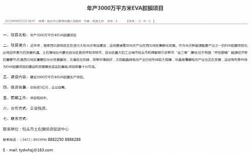 內(nèi)蒙古包頭擬建年產(chǎn)3000萬(wàn)平方米EVA膠膜項(xiàng)目