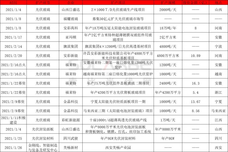自去年12月16日工信部宣布放開光伏玻璃擴產(chǎn)限制后,2021年開年至今,安彩高科、安彩新能、亞瑪頓紛紛加速光伏玻璃擴產(chǎn)。1月8日,安彩高科宣布與博愛凌創(chuàng)合資成立焦作安彩新材料有限公司,開展年產(chǎn)18萬噸壓延太陽能電池封裝玻璃項目建設(shè)。1月17日,亞瑪頓旗下鳳陽硅谷智能有限公司二期項目“年產(chǎn)2億平方米特種超薄鍍膜雙玻組件用玻璃項目”在滁州舉行開工儀式。2月20日,安彩新能年產(chǎn)4800萬平方米光伏輕質(zhì)基板項目開工,項目投資10.89億,涵蓋1.8~4.0mm厚度光伏玻璃產(chǎn)品,支持超大規(guī)格電池組件。