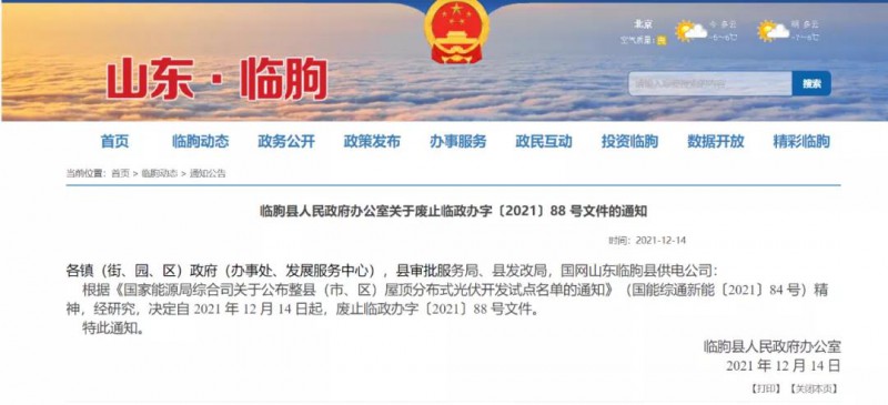 12月14日,臨朐縣人民政府辦公室下發(fā)了《關(guān)于廢止臨政辦字〔2021〕88 號(hào)文件的通知》,提出: