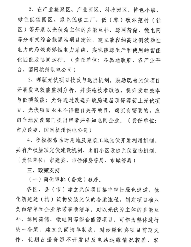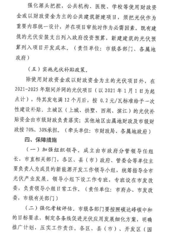文件提到:除使用財(cái)政資金或以財(cái)政資金為主的光伏項(xiàng)目外,在2021-2025年期間并網(wǎng)的光伏項(xiàng)目(以2021年1月1日為起點(diǎn)計(jì)),待其發(fā)電滿12個(gè)月后,按0.2元/瓦標(biāo)準(zhǔn)給予一次性建設(shè)補(bǔ)貼。主城區(qū)(上城、拱墅、西湖、濱江)的光伏補(bǔ)貼資金由市級財(cái)政負(fù)責(zé)落實(shí);其他地區(qū)由屬地財(cái)政及市級財(cái)政按70%、30%承擔(dān)。(牽頭單位:市財(cái)政局、各屬地政府)